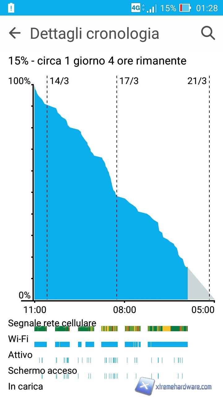 Giungiamo quindi a discutere il punto clou di questo dispositivo. La batteria dello Zenfone Max offre una capacità di ben 5000mAh e garantisce un’autonomia senza pari. Nel nostro caso non abbiamo stressato eccessivamente lo smartphone e ci siamo limitati ad un’utilizzo di circa 1h di schermo attivo al giorno, situazione piuttosto comune per chi è occupato durante l’intera giornata sul lavoro o magari in università.
